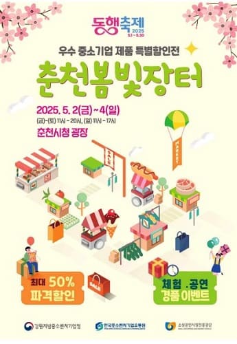 5월 2일부터 4일까지는 세종시 중앙공원, 춘천시 호반광장, 인천시 소래포구 해오름광장, 나주시 빛가람호수공원 등에서 동행축제 개막행사가 열립니다. 춘천시청 호반광장에서 열리는 '춘천봄빛장터'에서는 우수 중소기업 제품 판매전이 열려 가정의 달을 맞아 선물을 구매하려는 고객들에게 도내 우수한 중소기업 제품을 접할 수 있는 기회가 됩니다. 역대 최대 규모인 80개 기업이 참여합니다. 로컬푸드, 전통주, 베이커리, 뷰티 등 다양한 제품을 정상가의 최대 50%할인, 1+1 등의 저렴한 가격으로 선보입니다. 또 가족단위 방문 고객들을 위한 달고나 만들기 등 추억의 놀이터부터 송곡대(K-뷰티, 스포츠마사지) 및 메이커스페이스(세경대, 상지대, 강원정보문화산업진흥원) 등 체험프로그램과 어린이 장보기 체험, 러브썸 노래방, 직장인밴드 공연 등 다양한 부대행사가 예정되어 있습니다. 각 지역마다 특색 있는 무대와 프로그램이 준비되어 있어 가족과 함께 나들이 삼아 가기 딱 좋아요. 게다가 전주 웨리단길, 청주 성안길 등 전국 18개 지역에서는 순차적으로 지역 특산물 판매전과 문화공연 이벤트가 열려요. 지역별로 다채로운 볼거리와 살거리, 즐길 거리가 가득하기 때문에, 축제를 즐기면서 지역경제에도 힘을 보탤 수 있답니다. 또 인천국제공항에 있는 '판판 면세점'을 포함한 중소기업 전용 판매장 6곳에서도 1000개 제품을 30~50%까지 할인 판매하니, 공항 이용할 계획이 있다면 쇼핑 찬스로 삼아 보세요. 대형 쇼핑몰이나 아웃렛 못지않게 알찬 혜택을 받을 수 있는 좋은 기회입니다.